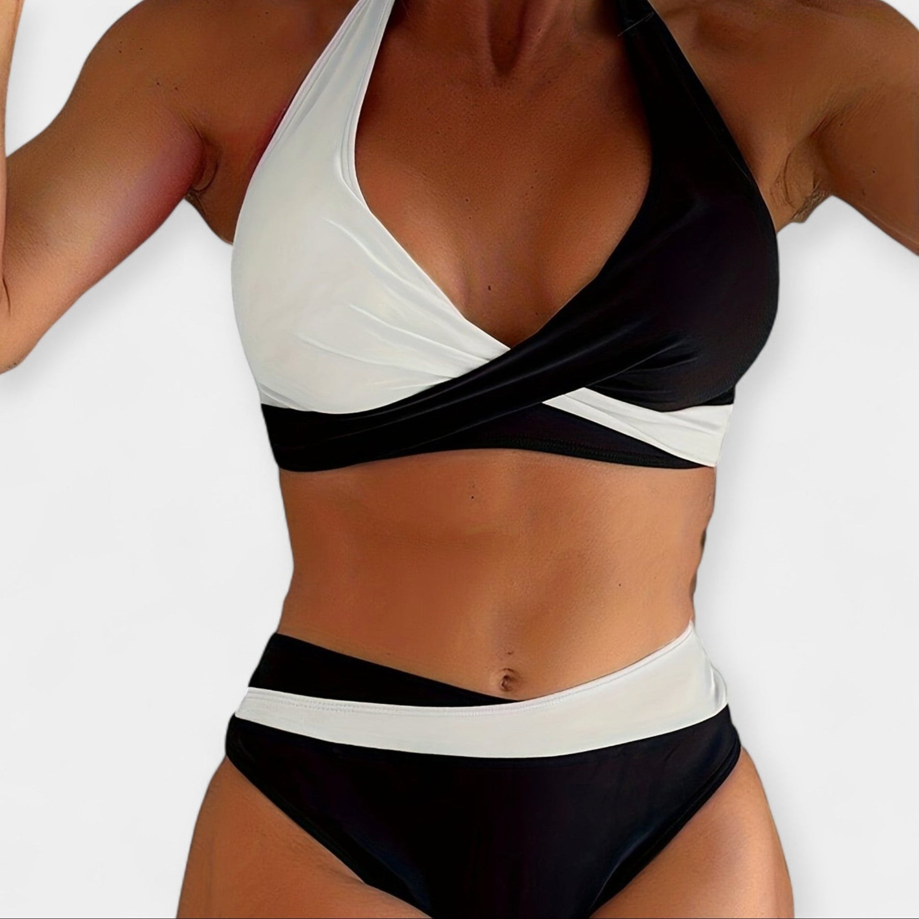 Šis seksīgais divdaļīgais bikini pārsteidz ar savu minimālistisko dizainu un krustenisko akcentu uz dekoltē. Tas smalki izceļ sievišķību, ideāli piemērots elegantiem izskatiem pludmalē vai jūsu vasaras bēgumos.