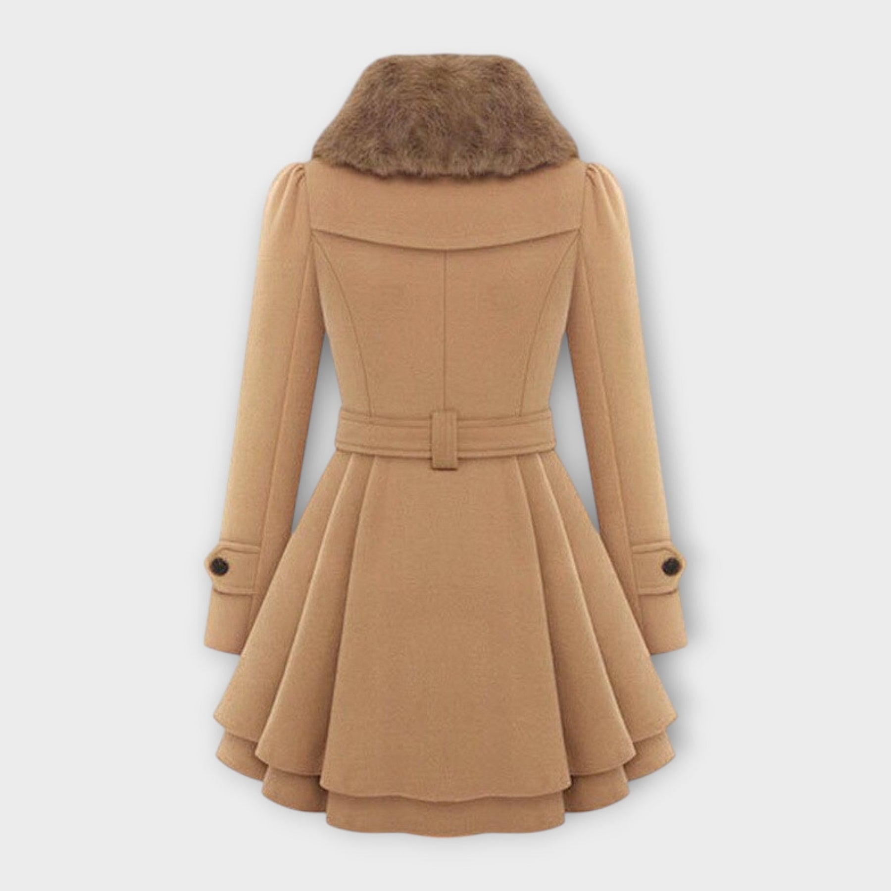 Mūsu sieviešu mētelis ar vilnas apkakli apvieno retro šarmu un moderno izsmalcinātību. Izcelts viduklis un paplašināts svārku dizains uzsver siluetu, piešķirot sievišķību un eleganci aukstajās dienās.