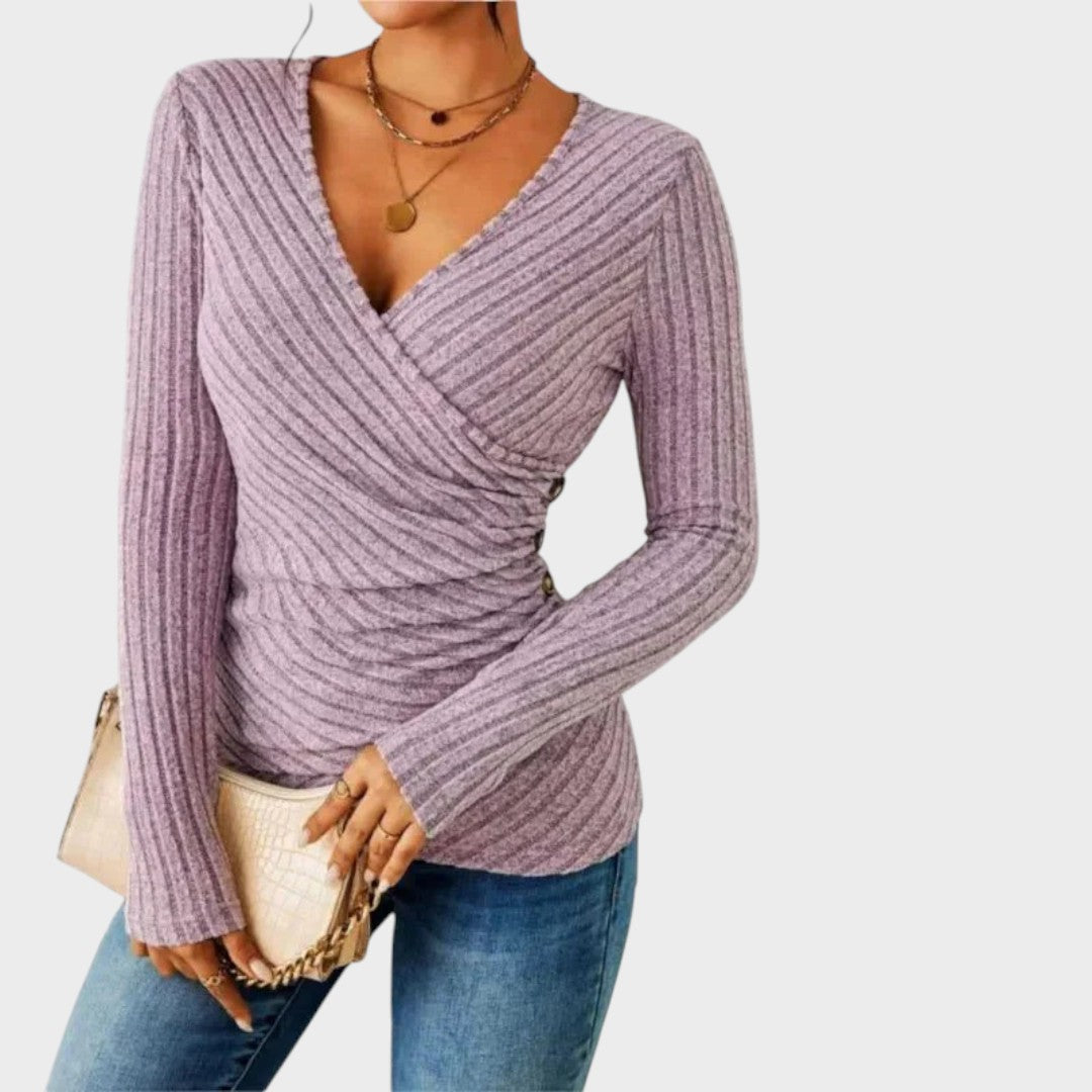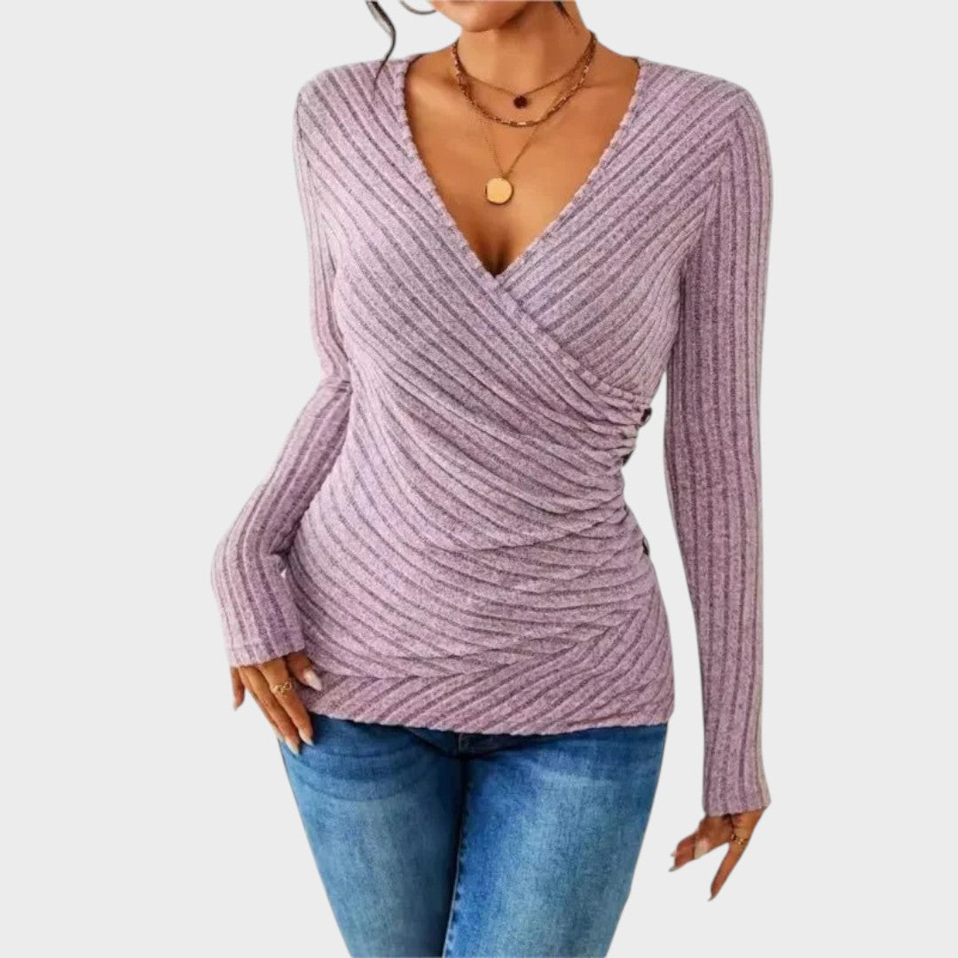 Šis stilīgais tops ar V formas izgriezumu un garām piedurknēm ir izstrādāts, lai izceltu jūsu figūru un vienlaikus nodrošinātu komfortu. Īpašais šuvuma dizains vizuāli formē jostasvietu un vēderu, sniedzot slaidāku siluetu. Mīksta un elastīga auduma sastāvs ļauj ērti kustēties, tāpēc šis tops ir lieliski piemērots gan ikdienas valkāšanai, gan īpašiem gadījumiem.